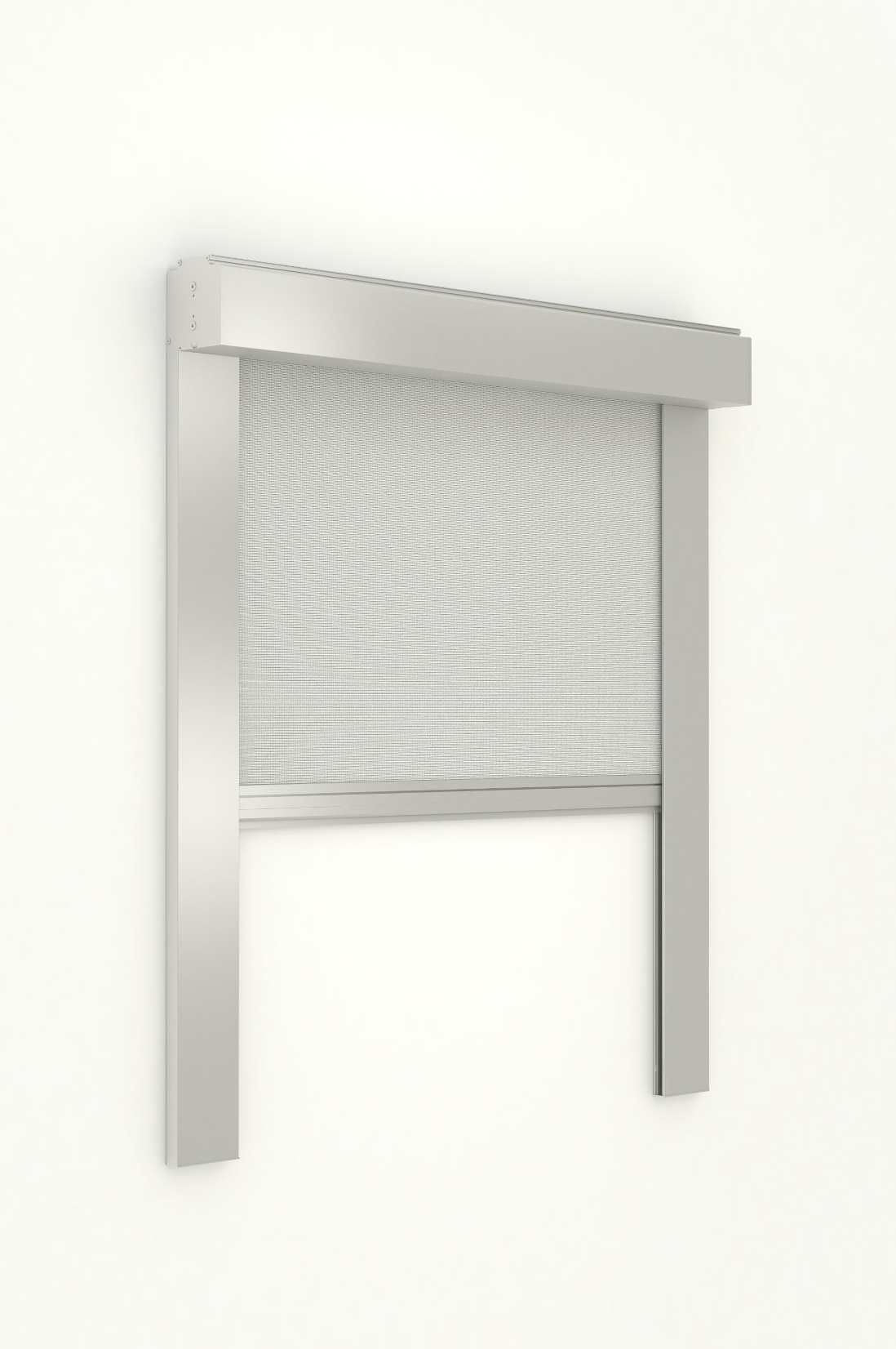 La guida laterale in alluminio è in dimensione di 100 x 22 mm e dotata di spazzolino bloccarete di serie per garantire il contenimento del telo in caso di vento e diminuendo la possibilità di rottura in caso di sfondamento. Inoltre il telo, confezionato senza bottoni o zip laterali, può essere agevolmente sostituito in caso di rottura. La zanzariera è disponibile con comando ad argano o motore. È possibile installare il cassonetto con supporti a soffitto in acciaio zincato.