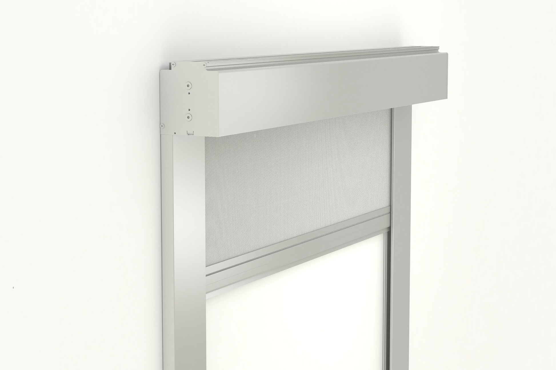 Il cassonetto in alluminio in due parti componibili di 103 x 116 mm, con design quadro, permette di proteggere le superfici vetrate con un design semplice e minimalista.