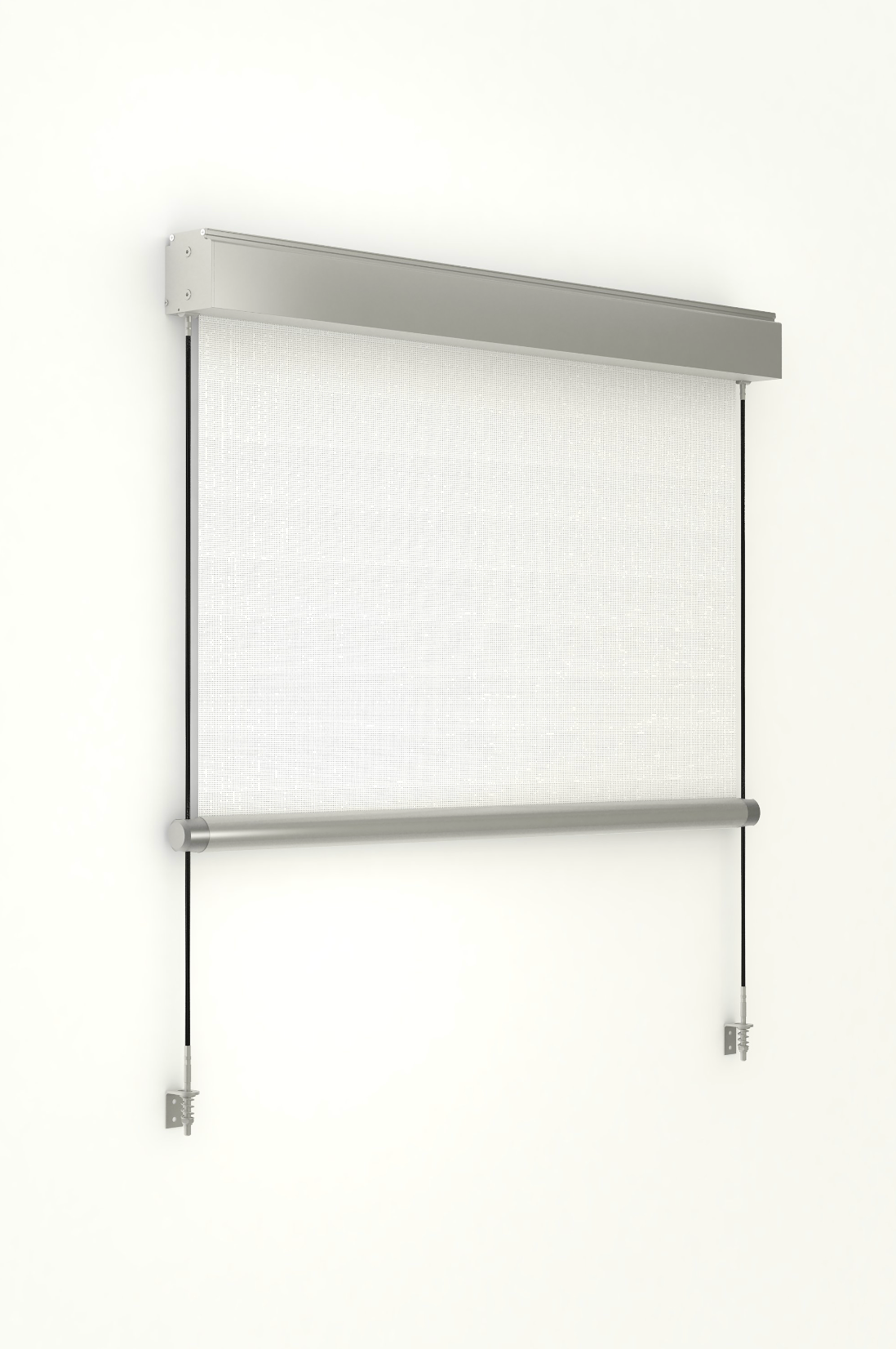 Le funi inox possono essere ancorate a parete o pavimento mediante speciali supporti che garantiscono una messa in trazione costante del cavo. La tenda è disponibile con comando ad argano o motore. È possibile installare il cassonetto con supporti a soffitto in acciaio zincato.