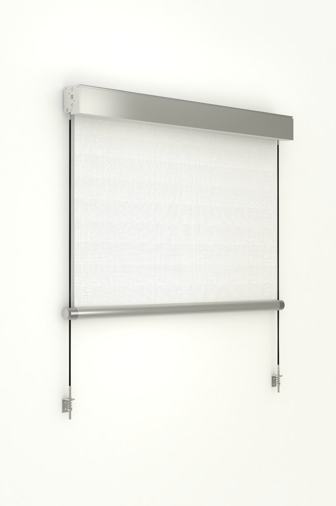 Le funi inox possono essere ancorate a parete o pavimento mediante speciali supporti che garantiscono una messa in trazione costante del cavo. La tenda è disponibile con comando a catena, argano o motore. È possibile installare il cassonetto con supporti a soffitto in acciaio zincato.