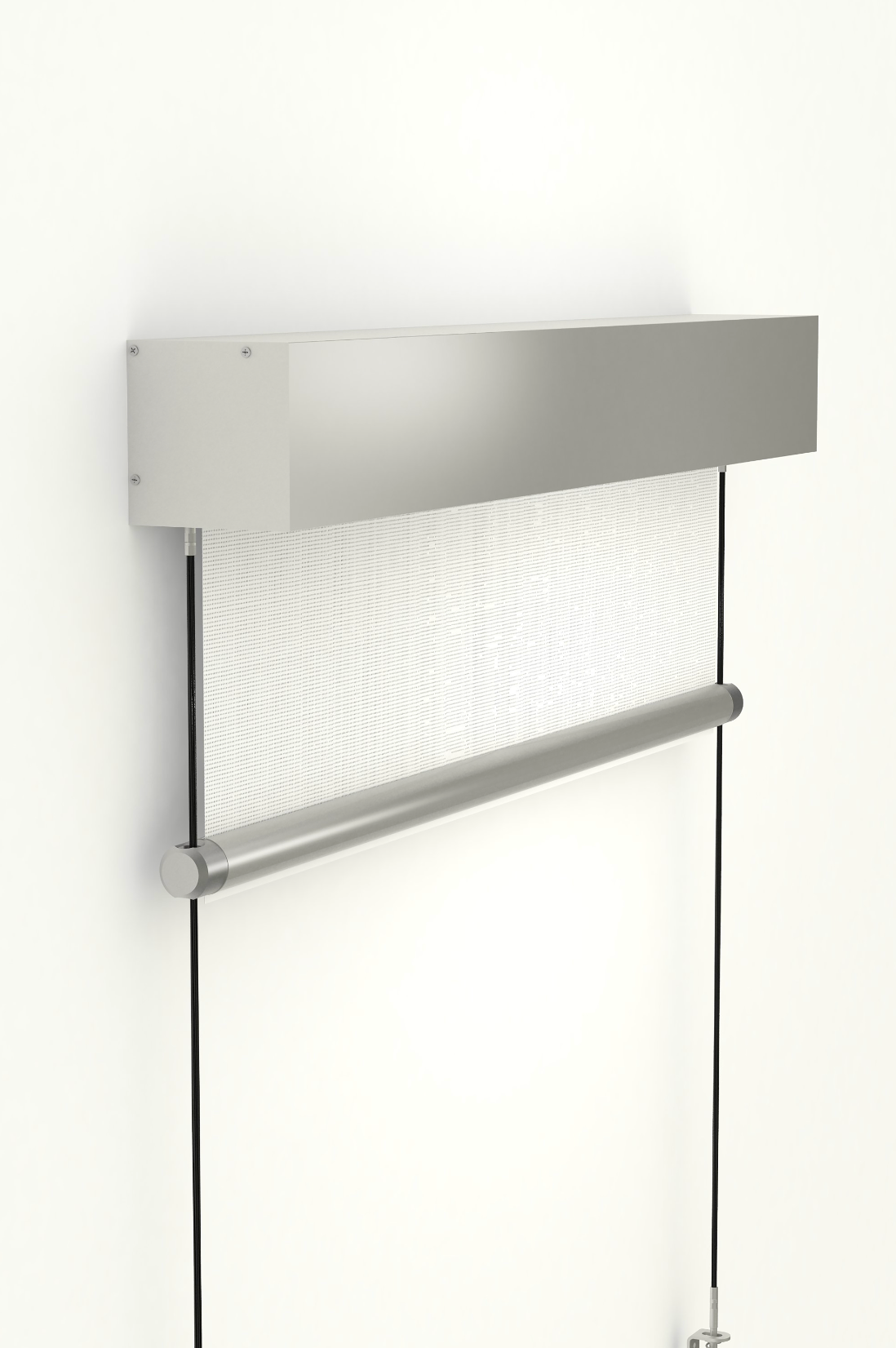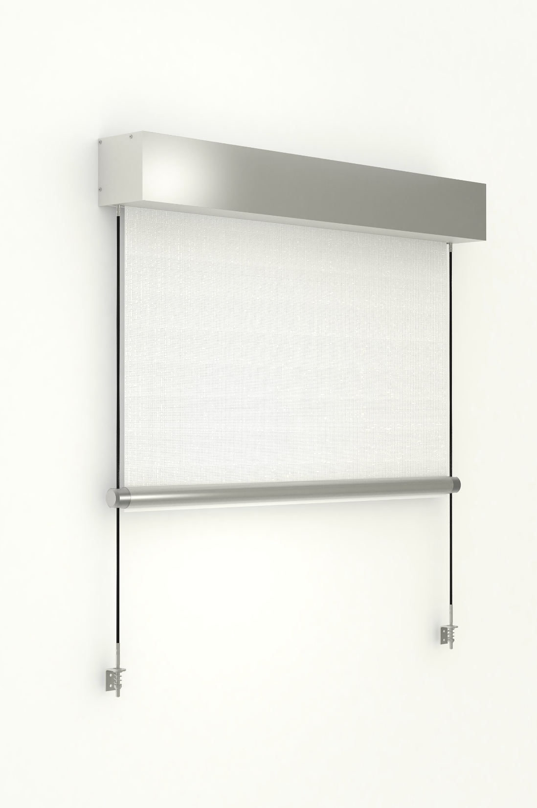 Le funi inox possono essere ancorate a parete o pavimento mediante speciali supporti che garantiscono una messa in trazione costante del cavo. La tenda è disponibile con comando a motore. È possibile installare il cassonetto con supporti a soffitto/parete in acciaio zincato.