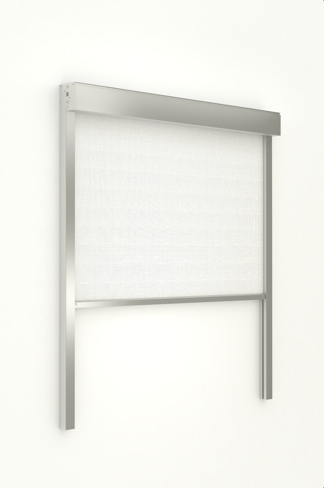 Il cassonetto in alluminio nelle dimensioni ridotte di 73 x 87 mm, con design quadro, permette di nascondere integralmente il fondale quando la tenda è avvolta. La guida laterale in alluminio è anch’essa in dimensione ridotta di soli 36 x 32 mm e garantisce una elevata resistenza al vento senza compromettere l’estetica del vano finestra.