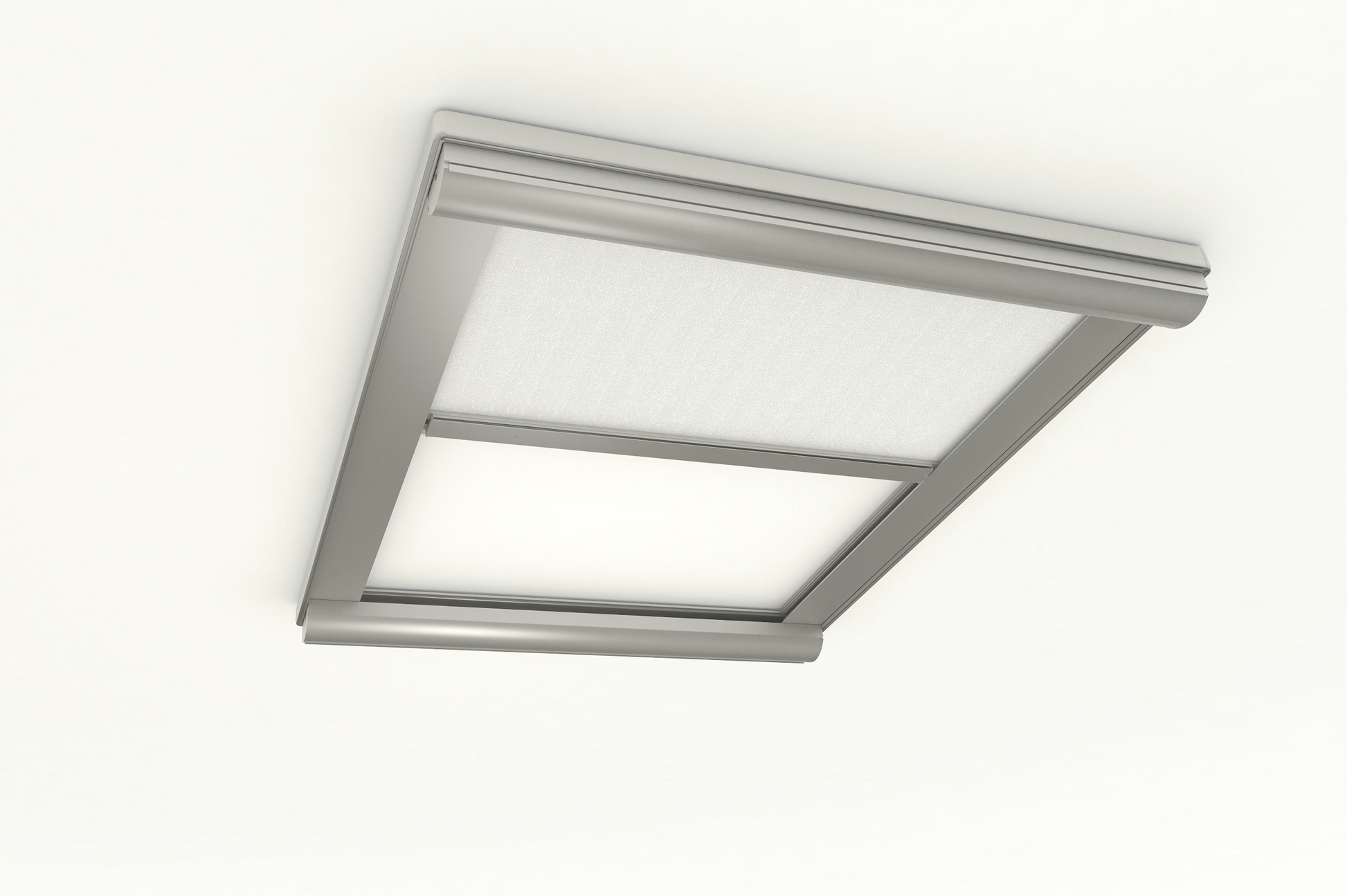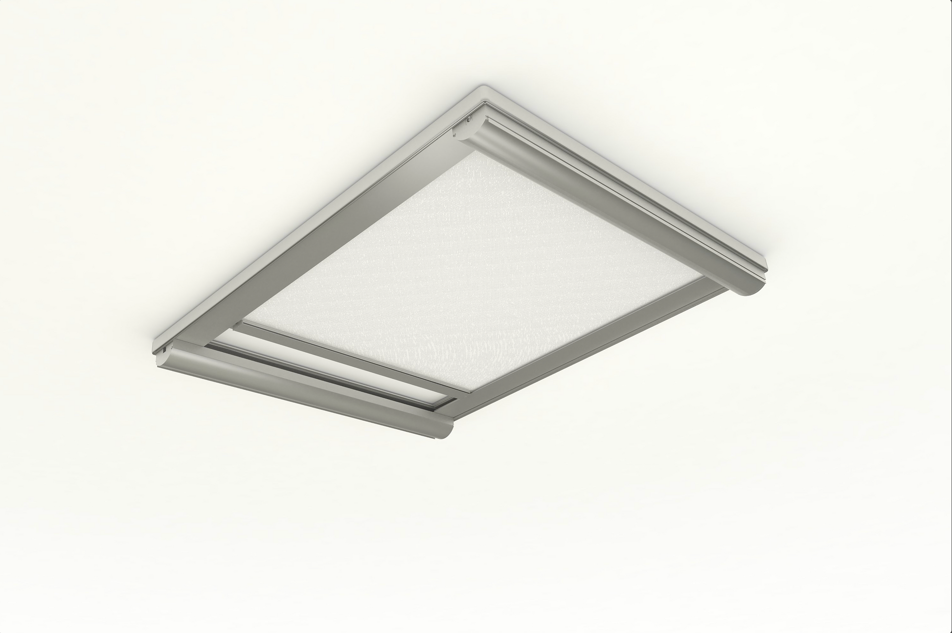 I due cassonetti contrapposti in alluminio di 67 x 72 mm, con design tondo, permettono di proteggere con affidabilità lucernai e in generale tutti i sistemi di illuminazione naturale zenitale. La guida laterale in alluminio è in dimensione di 70 x 22 mm.